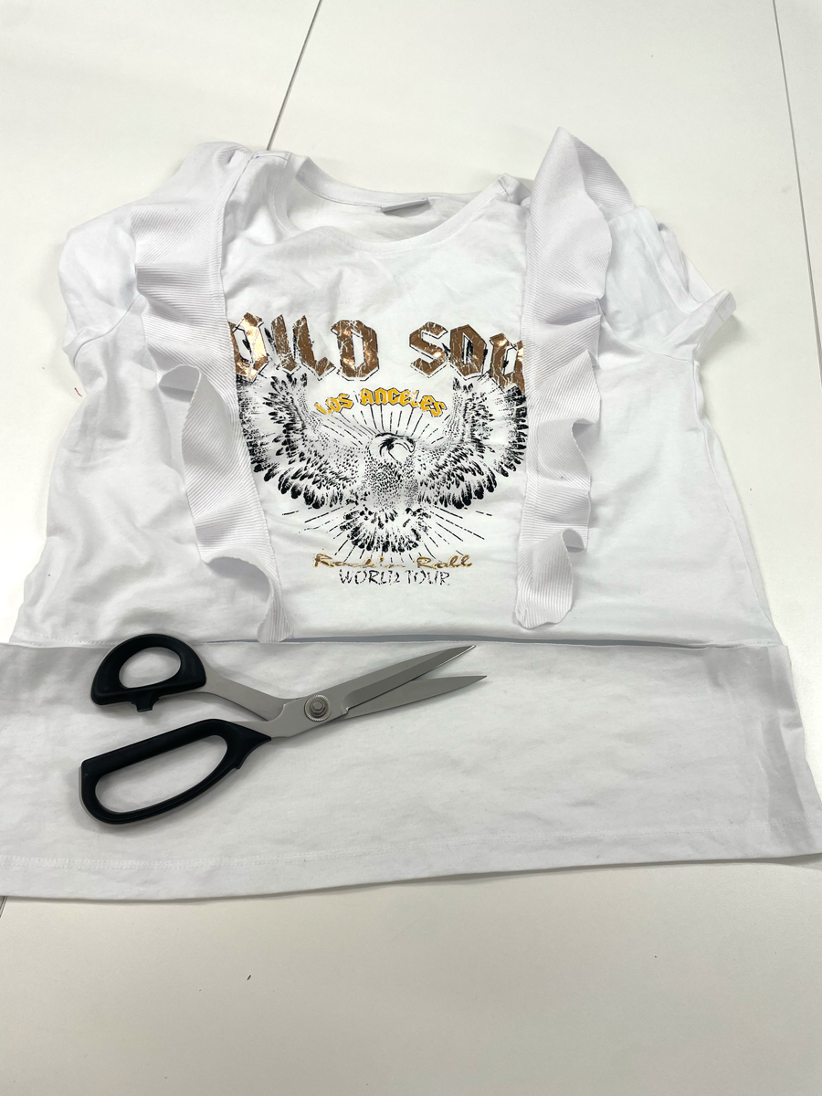0,35 m nebo žebro úpletu v ladící nebo stejné barvě trička (velikost střihu volánu je 30x32 cm),