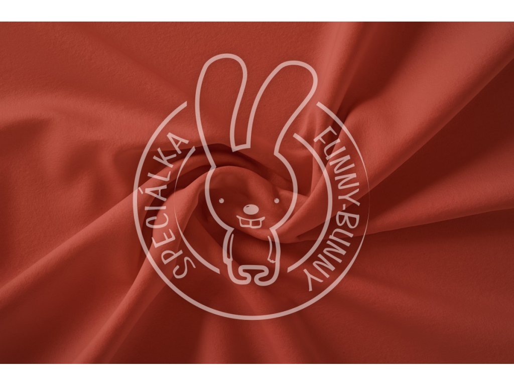 Červenohnědá (rezavá) bavlněná teplákovina s elastanem v odstínu Rusty –počesaná varianta rubové strany. Tato TRENDY BARVA tzv. Funny-Bunny speciálka je metráž v barvě, kterou nikde jinde nenajdete, protože ji necháváme barvit na míru.