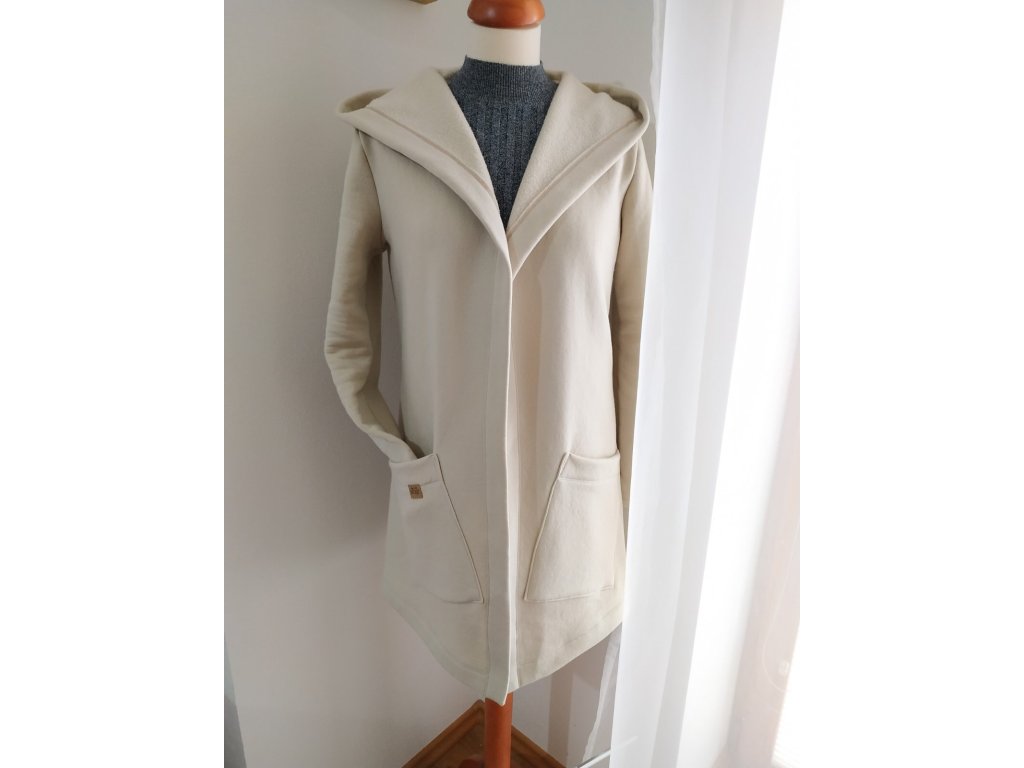 Nepočesaná teplákovina v barvě bílé kávy neboli Ecru je metráž bavlněné látky s malou příměsí elastanu, který zlepšuje pružnost látky.