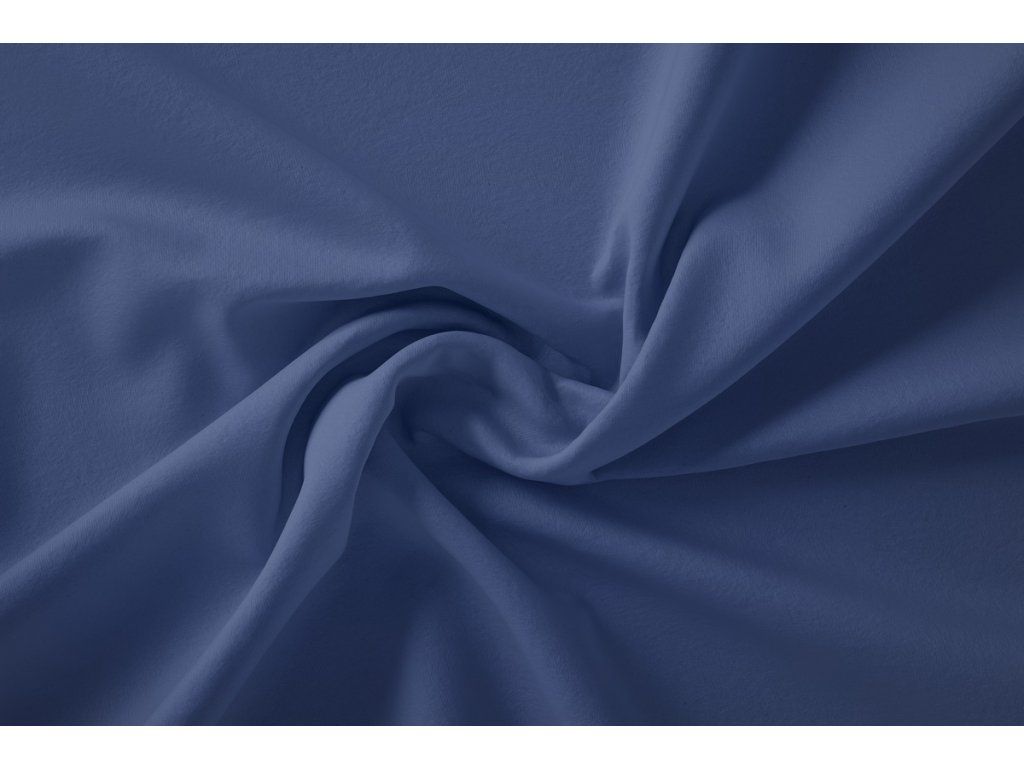 Jednobarevná teplákovina v barvě holubí modři s příměsí elastanu nebo polyesteru.