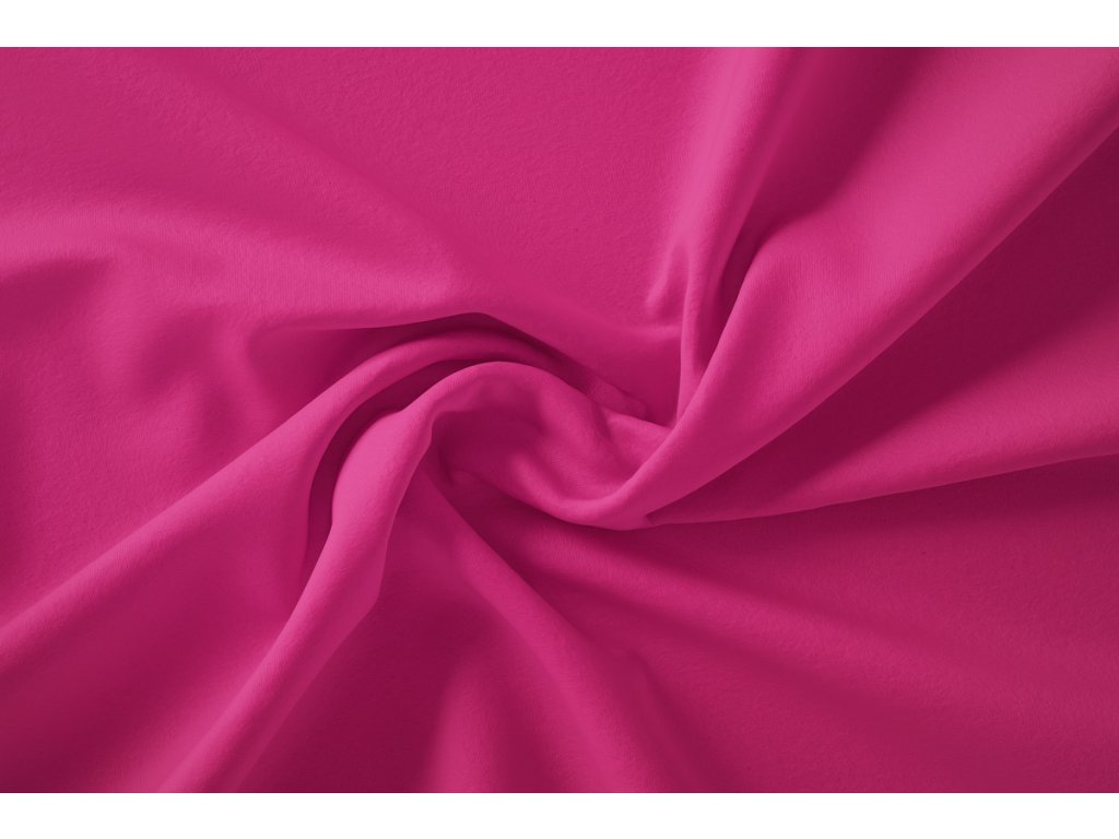 Jednobarevná teplákovina v sytě růžové malinové barvě s příměsí elastanu nebo polyesteru.
