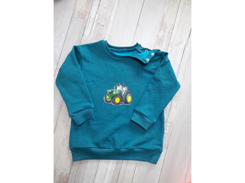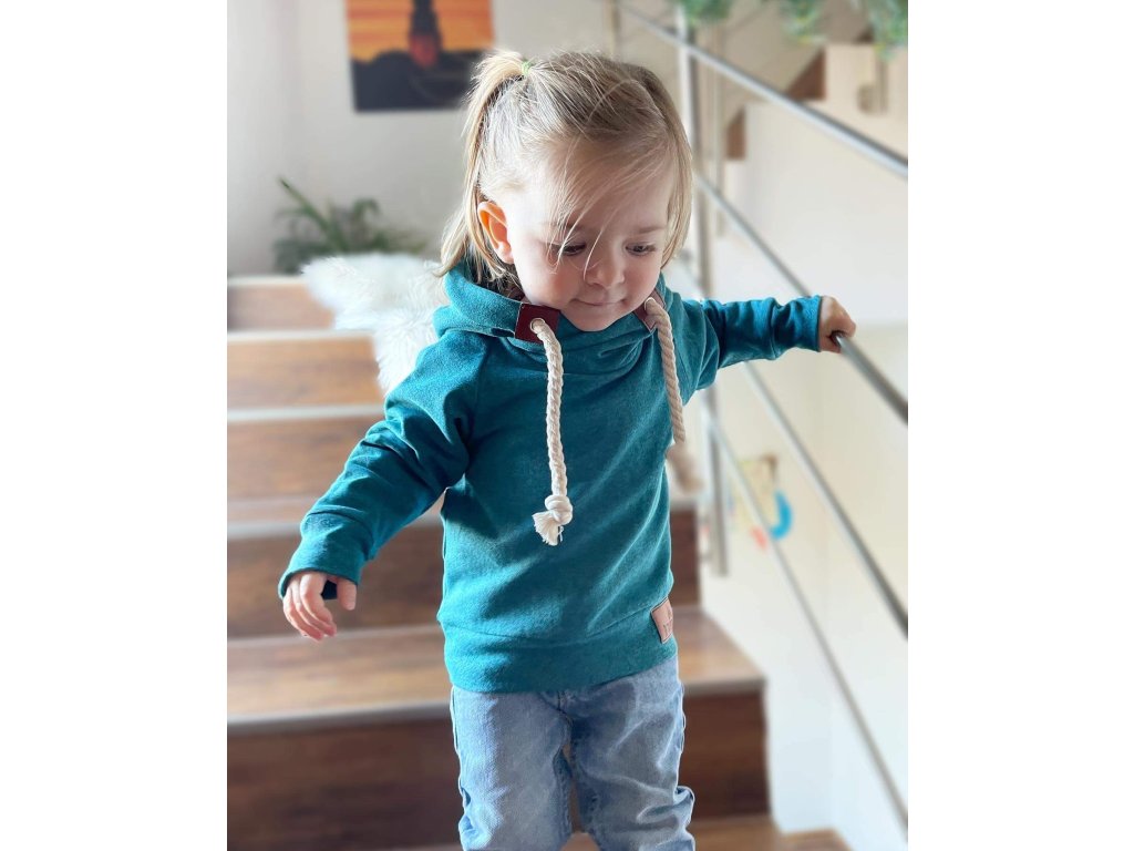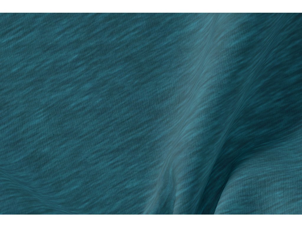 Jak vypadá modrá (tyrkysová) teplákovina s melírem a s nepočesanou rubovou stranou?
