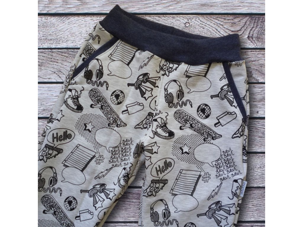 Papírový střih na dětské tepláky s praktickými klínovými kapsami, které díky nápletovému zakončení rostou s dítětem. Ideální pro každodenní nošení - pokud jsou nohavice delší, náplet se opře o nárt a děti si nešlapou.