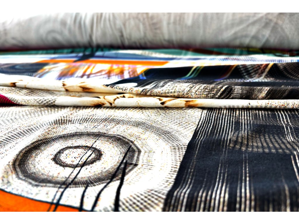 Vzor obsahuje výrazné vzory, které jsou silně stylizované a barevně přehnané, s nádechem ručně malovaného nebo digitálně uměleckého stylu. Pozadí je světlejší, čímž se vzor hezky zvýrazňuje.